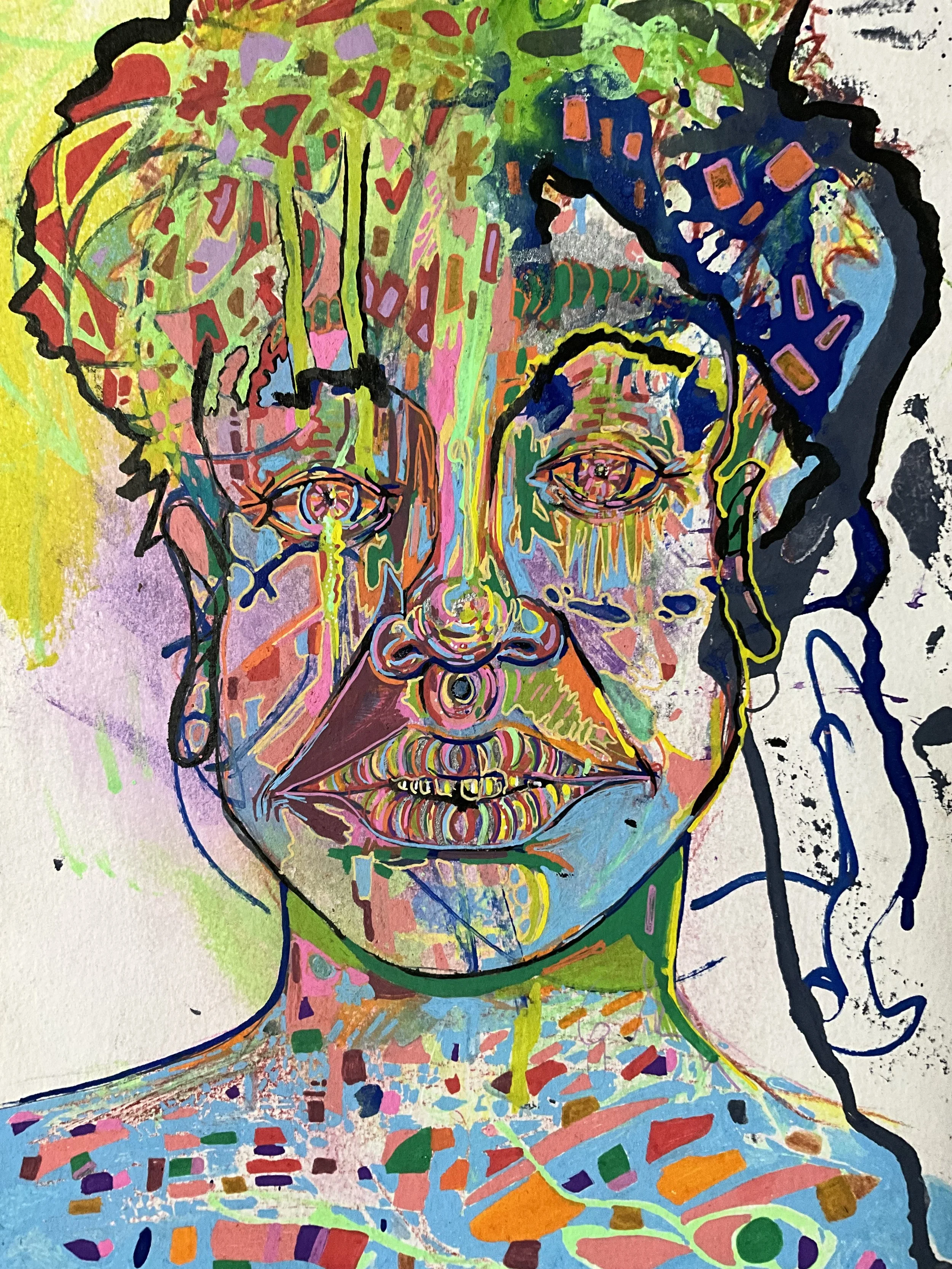 Working intuitively with acrylics, inks, and found materials, I create fragmented portraits and experimental abstracts that examine our aggressively hyper-connected yet increasingly isolated modern world.